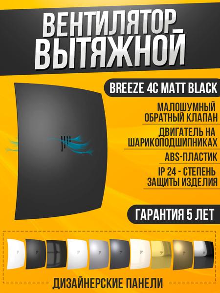 Вентилятор Breeze 4C применяется для постоянной или периодической вытяжной вентиляции санузлов, душевых, кухонь и других бытовых помещений. Дизайнерская серия BREEZE имеет нестандартную форму и лаконичный дизайн. Лицевую панель легко снять и помыть или просто убрать пыль с корпуса и крыльчатки. Модель оснащена обратным клапаном, который предотвращает проникновение неприятных запахов из шахты. Двигатель на шарикоподшипниках не требует дополнительного обслуживания и дает возможность установить вентилятор как в вертикальном, так и в горизонтальном положении (при снятии обратного клапана). Изготовлен из долговечного ABS-пластика. Монтаж осуществляется с помощью саморезов, которые входят в комплект.