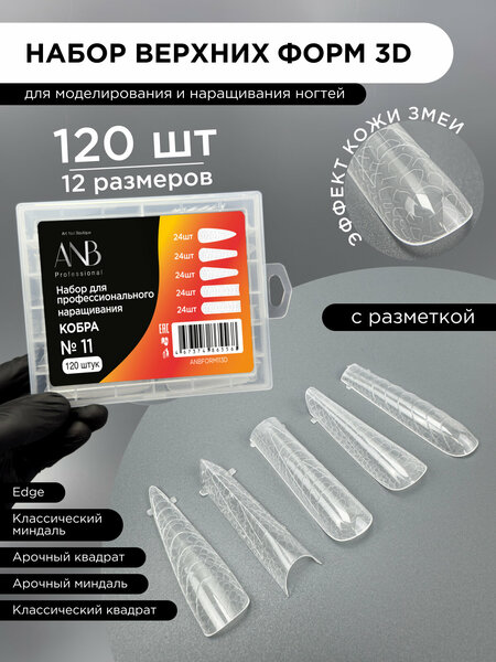 Уникальный набор верхних форм с дизайном кожи змеи а от ANB Professional идеальное решение для профессионального маникюра. В набор входят 12 размеров верхних форм с дизайном рептилии по 24 шт каждого вида: арочный квадрат, арочный миндаль, классический миндаль, универсальный изгиб. Многоразовые верхние формы с разметкой предназначены для укрепления, моделирования и наращивания натуральных ногтей. На каждой типсе нанесена четкая разметка, которая сделает процедуру быстрой и эффективной. Дизайн кожи рептилии подходит под новый год змеи. Благодаря своей тонкой форме, типсы отлично садятся на ноготь и обеспечивают оптимальную толщину наращенного свободного края. Эластичность форм дает возможность выровнять любую ногтевую пластину и добиться красивой, и эстетичной архитектуры ногтей.