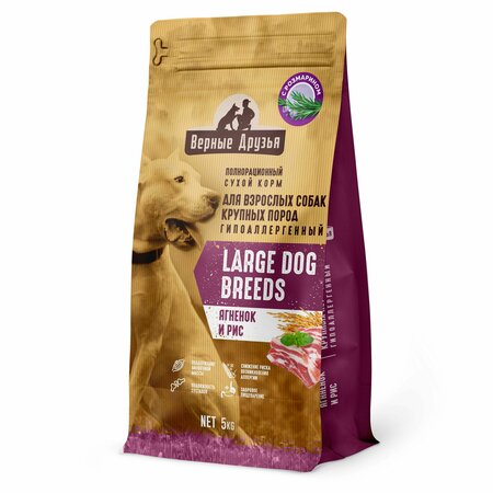 Сухой полнорационный гипоаллергенный корм для взрослых собак крупных пород «Верные друзья» специально разработан для удовлетворения потребностей в питательных веществах организма взрослой собаки и включает в состав хондропротекторы для профилактики заболеваний суставов. Полезная рецептура содержит высококачественные и легкоусвояемые ингредиенты (мясо ягненка, рис). Ценные омега-3 и омега-6 жирные кислоты обеспечивают здоровье кожи и блестящую шерсть. Корм «Верные друзья» идеально подходит чувствительным к корму собакам с нормальными потребностями в энергии и протеине. Формула содержит все витамины и минеральные вещества, необходимые для сбалансированного питания собаки. Корм не содержит искусственные ароматизаторы и красители.