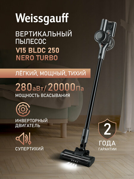 Weissgauff представляет новый мощный вертикальный пылесос с циклонной системой фильтрации, которая эффективно разделяет загрязнённый воздух на мусор и очищенный воздушный поток и работает без мешка для сбора пыли. Турбощётка с подсветкой идеально подходит для уборки паркета и ламината, не повреждая поверхности. Инверторный двигатель нового поколения справляется с любыми загрязнениями. Настенная подставка позволяет компактно хранить пылесос, а съёмная рукоятка даёт возможность использовать его как в вертикальном, так и в портативном режиме. Турбощетка для ламината и паркета имеет специальное мягкое покрытие из нейлоновой ткани, позволяющее эффективно, но при этом бережно проводить уборку, не повреждая поверхности пола! Инверторный двигатель позволяет дополнительно увеличить производительность пылесоса, снизив потери энергии, свойственные поколению традиционных двигателей. Теперь вы уверены, что вся мощь этого великолепного устройства от Weissgauff направлена на то, чтобы обеспечить невероятно высокие результаты уборки! Технология SuperSilent обеспечивает сниженный уровень шума - всего 82 дБ, что сделает процесс уборки ещё комфортнее! Максимальная мощность 280 Вт это поистине фантастический показатель, обеспечивающий разрежение 20 кПа! Именно такой, по-настоящему мощный двигатель и является сердцем нашего пылесоса, не оставляющим загрязнениям ни единого шанса! Три различных трансформируемых режима: стандартный вертикальный пылесос, портативный пылесос, пылесос для уборки щелей и уборки труднодоступных мест! Пылесборник стаканного типа, с которым вы сможете забыть о тех временах, когда нужно было стирать и чистить сменные мешки после уборки! Простым нажатием кнопки, опорожняйте отсек пылесборника - и он уже снова готов к работе! Светодиодная подсветка зоны уборки позволяет легко ориентироваться во время уборки в самых темных углах и под крупной мебелью! Настенное крепление, предназначенное для хранения пылесоса во время зарядки, сделает более удобным его размещение в вашем доме! Съемный аккумулятор 2200 мАч даст уверенность в том, что пылесос не выключится в процессе уборки в самый неподходящий момент и позволяют им бесконечно продлевать срок службы пылесоса, просто меняя батарейку по мере её износа. Комплектация устройства включает в себя основной блок с двигателем, трубка удлинитель, зарядное устройство, настенное крепление, электрическую турбощетку для ламината и паркета, а также щелевую насадку для уборки труднодоступных мест!