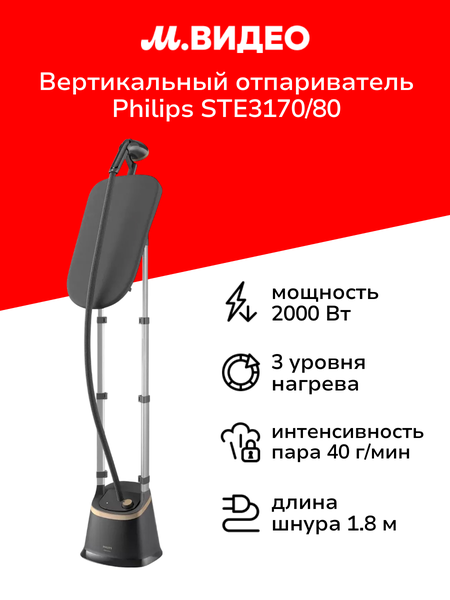 Вертикальный отпариватель Philips STE3170/80 подходит для вертикального и горизонтального отпаривания. Эта модель оборудована резервуаром для воды объемом 2 л, наклонной гладильной доской. Заложены три температурных режима. Пар подается интенсивностью до 40 г/мин. Управление обеспечивает механический переключатель. Корпус выполнен из пластика, подошва утюжка - из металла. Высоту стоек можно регулировать. Для шланга предусмотрен специальный держатель. Прибор получает питание от электросети, оборудован кабелем длиной 1,8 м. При перегреве срабатывает автоотключение. В этой модели реализована технология самоочистки от накипи. В комплект входит защитная рукавица. Габариты отпаривателя - 172х31х32 см, вес - 4,23 кг.