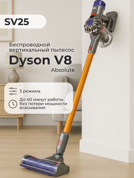 Вертикальный пылесос Dyson V8 Absolute (SV25) (Silver Yellow), предназначен для эффективной сухой уборки, обеспечивая до 40 минут непрерывной работы. Двигатель с цифровым управлением вращается со скоростью до 110 000 об/мин, обеспечивая мощное всасывание. Особенности: Высокая мощность. Во время уборки выбирайте один из двух режимов мощности, чтобы обеспечить правильный баланс эффективности и времени работы там, где это необходимо. Режим Max обеспечит более сильное всасывание для короткой и интенсивной уборки, а стандартный режим подходит для более продолжительной работы. Технология Root Cyclone улавливает пыль и мусор из воздушного потока без потери всасывания, поддерживая максимальную мощность. Усовершенствованная фильтрация. Полностью герметичная система фильтрации Dyson улавливает пыль и задерживает 99.99% микроскопических частиц и аллергенов размером до 0.3 микрона, выпуская более чистый воздух в ваш дом. Чистящая насадка Motorbar. Распутывающая насадка для чистки Motorbar собирает грязь, пыль и волосы со всех типов полов. Жёсткая нейлоновая щетина глубоко очищает ковры, удаляя грязь и пыль. Внутри чистящей головки находятся лопасти из поликарбоната, благодаря чему насадка справляется с шерстью или длинными волосами, отправляя их прямо в контейнер. Насадки: Комбинированная насадка 2 в 1 подходит для быстрого переключения между задачами по уборке и удалению пыли в доме или автомобиле. Щелевая насадка специально разработана для очистки сложных, труднодоступных и узких мест. Лёгкий и эргономичный. Мотор и аккумулятор расположены вокруг ручки, создавая оптимальный центр тяжести для лёгкой уборки от пола до потолка Бесконтактная очистка. Гигиеничная система опустошения контейнера позволяет удалить грязь и пыль одним действием. Удобное хранение. Пылесос Dyson всегда под рукой на настенной зарядной док-станции, его легко хранить и он сразу готов к работе, когда он вам понадобится.