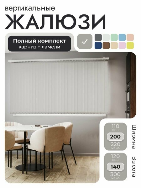 Вертикальные тканевые жалюзи 200x140 см от Унистайл, предназначены для установки на стены и потолок, внутри и снаружи проемов. Полный комплект вертикальных жалюзи: карниз и ламели. Важно: высота вертикальных жалюзи указана - полностью готового изделия, то есть карниз и ламели вместе. Ламели выбранным цветом в сборе (нижние грузики, держатели ламели, нижняя цепочка). Характеристики: 1. Прочный и легкий алюминиевый карниз; 2. Ширина ламели 89мм; 3. Управление при помощи цепочки и веревки; 4. Перемещение ламелей осуществляется с помощью веревки, а поворот ламелей - посредством цепи управления; 5. Ламели уходят - к управлению; 6. Могут крепиться к потолку, стене или оконному проёму.