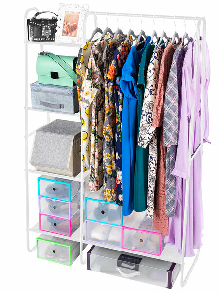 Достоинства:Компактный, вместительный, универсальный цвет и простая сборка Недостатки:Та же компактность Комментарий:Хорошая вешалка, собрала быстро без подручных инструментов (в комплектации был многогранник, спасибо!), докупила органайзеры и все вышло уютно и красиво