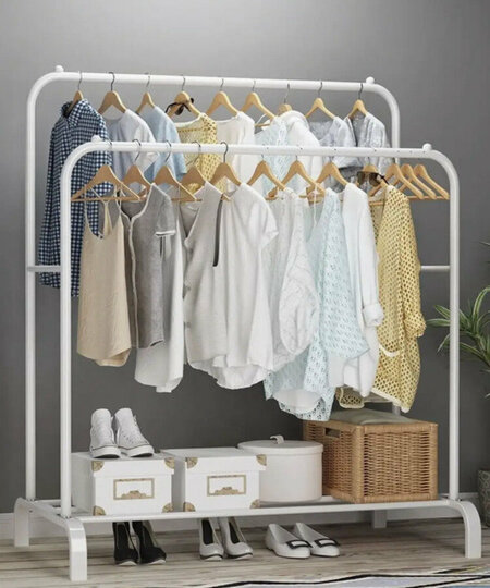 Вешалка для одежды — это система хранения вещей дома или в офисе. Вешало очень манёвренно, может перемещаться между комнатами. Использовать вешалку можно в спальне, гостиной, детской, прихожей комнате. Она оснащена двумя верхними штангами для плечиков. На нижней полке доступно место для хранения обуви, сумок или коробок. Быстрая и комфортная сборка, без специальных инструментов. Гардеробная вешалка выполнена из металла, имеет размер 1100 мм по длине и 1500 мм по высоте. Напольная вешалка лучший подарок на новоселье.