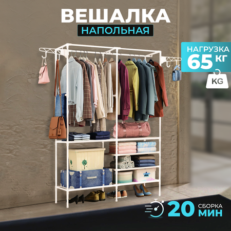 Достоинства:Простота сборки, компактная и одновременно вместительная. Много доп.крючков под сумки или другие вещи. Недостатки:Нареканий нет. Доработать бы саму конструкцию прорезиненными насадками на ножки или заменить полотно полок на ткань - но это не к продавцу наверное, а к производителю запрос. Комментарий:Без спешки вешалка собирается минут за 30-40. Инструкция простая. Запчасти легкие. Изначально может показаться, что слишком легкие. Но даже на неровной поверхности вешалка будет надежно стоять, когда вы нагрузите её вещами. Как открытый шкаф - прекрасное решение в маленькую комнату. Доп.крючки можно крепить с любой стороны. Возможно уберу одно полотно полки для длинных вещей и платьев. Лучшая покупка за последние месяцы))