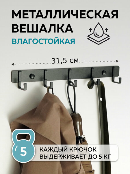 Металлическая настенная вешалка будет отличным решением для любого пространства. Модель отличается лаконичным дизайном и черным матовым покрытием, что особенно популярно в современных минималистичных интерьерах. Замените обычные крючки для одежды на цельную стильную вешалку для максимальной эргономики и эффективного использования пространства. Черная настенная вешалка имеет влагостойкое покрытие, что делает возможным размещение вешалки в ванной и кухне. Благодаря оптимальному расстоянию между крючками, данная модель легко заменит рейлинг над рабочей поверхностью в кухне. Вешалка для полотенец отлично подойдет в вашу ванную. Компактный размер также позволяет вписать вешалку в малогабаритную прихожую. Вешалка для прихожей будет идеальным решением. Вешалка с пятью крючками отлично подходит для одежды, полотенец, банных и хозяйственных принадлежностей, зонтов и сумок. Настенная вешалка поставляется в комплекте со всем необходимым для монтажа – с шурупами, дюбелями и заглушками, что исключает необходимость дополнительных затрат на установку. Крепкий алюминиевый сплав обеспечивает надежность вешалки. Каждый из пяти крючков способен выдержать существенную нагрузку. Также данную вешалку можно использовать как ключница настенная.