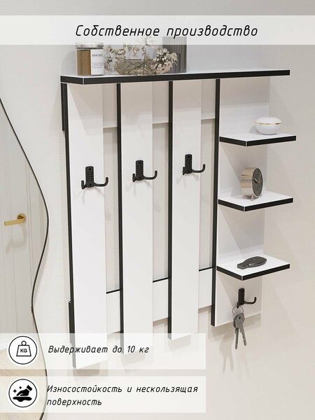Вешалка настенная с крючками и полками для одежды изготовлена из высококачественного ЛДСП класса Е1. Габариты: 590х670х160мм. Стильная, практичная, прочная для хранения аксессуаров, зонтов и сумок. Металлические крючки надежно крепятся саморезами и выдерживают большое количество верхней одежды. На полочках можно удобно разместить необходимые вещи. Благодаря лаконичному дизайну удачно впишется в любой интерьер лофт. Универсальную настенную вешалку можно повесить в любой комнате прихожей, коридоре, гостиной. Подойдет для дачи . Вешалка с крючками легко собирается. В комплекте инструкция по сборке и необходимый крепеж. Произведена в России на нашем собственном производстве