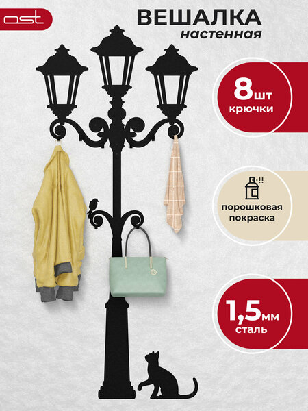 Вешалка настенная для одежды "Фонарь" от бренда OST - станет незаменимой частью интерьера в вашем доме! Помимо своего прямого функционала - хранение одежды, сумок, стеновая вешалка станет оригинальным украшением прихожей. Стильная композиция в виде уличного фонаря дополнена фигуркой кота. Вешалка не занимает много места и экономит пространство в коридоре. На 8 крючках найдется место для сумок, ключей и верхней одежды. Выполнена из 1,5 мм металла, покрыта качественной порошковой краской. Она надежно крепится к стене саморезами, которые идут в комплекте, а по удобству превосходит обычные громоздкие вешалки. Размер конструкции - 1750 мм*760 мм. Максимальная нагрузка 20 кг. Уже 10 лет мы производим в России предметы интерьера и товары для дома и дачи, а так же настенные часы. Большой выбор различных моделей товаров, вы можете найти на странице наших брендов 3D-Decor, OST, OST HOME и OST Garden.