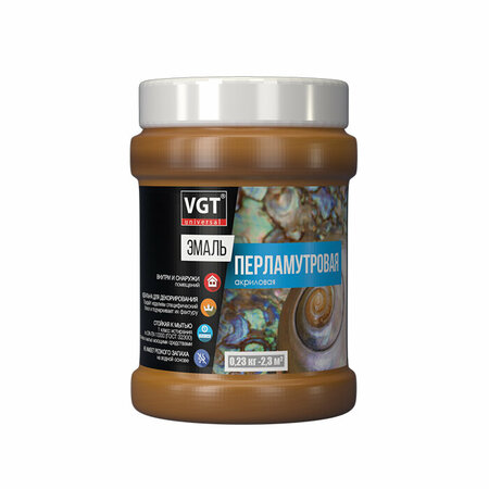 Подготовка поверхности Рабочая поверхность должна быть сухой и чистой. Отслаивающиеся старые покрытия должны быть удалены. При окраске поверхностей рекомендуется предварительное грунтование металлических поверхностей грунтовкой по металлу ТМ "VGT", минеральных - грунтовкой глубокого проникновения. Для усиления цвета под перламутровые эмали подложку можно заколеровать или окрасить цветными водно-дисперсионными материалами. Способ нанесения Эмаль наносить кистью, валиком или тампоном в 1-2 слоя. Базовые цвета Бронза Гранат Жемчуг Золото Серебристо-белая Хамелеон