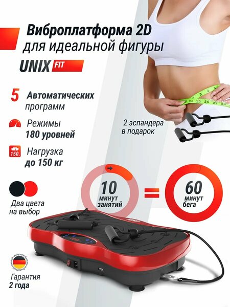 Ищете способ без мучений улучшить физическую форму, сжечь калории и укрепить мышцы? Виброплатформа UNIX Fit Intensive 2D Red вибро тренажер для похудения и пресса, тренажер для фитнеса, для дома (горизонтальные колебания 1-15 Гц) для вас! Виброплатформа UNIX Fit Intensive 2D – незаменимый помощник в борьбе за красивую фигуру и хорошее самочувствие. Эта многофункциональная виброплатформа подойдет тем, кто ценит свое время, стремится к физическому здоровью и красоте. Она поможет Вам в короткие сроки привести свое тело в порядок, укрепить мышцы, избавиться от лишнего веса и целлюлита без переутомления и чрезмерных нагрузок, сэкономив Ваше время и деньги на посещении фитнес центров и массажных салонов. Виброплатформа - это удобный инструмент, сочетающий в себе функции массажера и тренажера, который задействует практически все группы мышц и позволяет эффективно бороться с негативными последствиями малоподвижного образа жизни, восстановить правильное кровообращение и продлить молодость организма. Вы также можете использовать данную виброплатформу в качестве степ платформы, а комплект из двух эластичных эспандеров, крепящихся к основанию виброплатформы, дает возможность держать в тонусе плечи, мышцы рук, талии, ягодиц, бедер и икр. Вечерние упражнения на виброплатформе помогут снять усталость и напряжение после рабочего дня. Принцип действия виброплатформы основан на рефлекторном ответе мышц на совершаемые виброплатформой вертикальные вибрационные колебания. За счет вибрации происходит непроизвольное сокращение множества мышц для стабилизации тела — они сокращаются и расслабляются до 50 раз за секунду, что значительно повышает эффективность и интенсивность тренировок. Ставя ноги в различные позиции по отношению к центру виброплатформы, Вы сможете имитировать ходьбу, бег трусцой и бег, оставаясь при этом дома. Для пользователей с начальным уровнем подготовки рекомендуется использовать виброплатформу в течение 10 минут 3 дня в неделю. Занятия на виброплатформе помогут Вам: • Быстрее похудеть • Избавиться от лишнего веса • Привести в тонус и укрепить мышцы • Укрепить кости • Улучшить работу пищеварительной системы • Снять мышечное напряжение • Улучшить качество сна и отдыха • Контролировать уровень холестерина • Повысить физическую выносливость • Ослабить депрессию, снизить уровень стресса, бессонницы Преимущества виброплатформы: 1. Эффективные тренировки: Вибрации активируют до 90% мышц, что позволяет достигать результатов быстрее, чем при классических упражнениях. 2 эспандера в комплекте для дополнительной нагрузки на руки. 2. Удобство использования: Компактный и стильный дизайн позволяет легко разместить вибро тренажер в любом уголке вашего дома. Подходит для использования как новичками, так и опытными спортсменами. 3. Многофункциональность: Платформа предлагает различные режимы вибрации и интенсивности, а также 9 предустановленных программ, что позволяет адаптировать тренировки под ваши цели — от похудения до укрепления мышц. Таймер на 10 минут поможет контролировать ваши тренировки. 4. Улучшение кровообращения: Регулярные занятия на вибротренажере способствуют улучшению циркуляции крови, что положительно сказывается на общем состоянии здоровья, а также помогает прокачать мышцы ног, бедер и пресса. Возможность подсоед