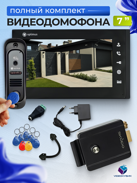 Полный комплект для самостоятельной установки видео домофона. Описание Видеомонитора: Цветной монитор оборудован 7 дюймовым TFT LCD дисплеем, с разрешением 800х480 пикселей. Видеодомофон поддерживает стандарты видео PAL/NTSC; Видеодомофон оснащен коммутационным реле с режимами работы Н. О и Н. З. Продолжительность беспрерывной беседы достигает 2 минут. Вызывная панель при этом может располагаться от видеодомофона на расстоянии до 100м. К домофону возможно подключить 2 вызывные панели, 2 аналоговые камеры. С монитором совместимы 4-проводные вызывные видеопанели Optimus Leader 2.0. Устанавливается накладным способом при помощи пластины, которая идет в комплекте; 16 мелодий на выбор; Регулировка громкости Монитора и Вызывной панели; Регулировка Яркости и Контрастности монитора; Открытие замка без вызова. Возможность подключения 2 вызывных панелей и 2 аналоговых видеокамер. Описание Вызывной панели: Вызывная панель оснащена считывателем для брелоков формата EM-marine и коммутационным реле с режимами работы Н. О и Н. З. Программирование контроллера считывателя происходит через брелоки администратора, которые также можно заменить при утрате. Угол обзора камеры составляет 65 (горизонтальный) 80(диагональный). В вызывной панели встроена 1/3” CMOS цветная матрица с разрешением 700 ТВЛ что дает изображение отличного качества. Панель оснащена ИК-подсветкой(940нм) дальностью до 1,5м, что позволяет видеть в ночное время суток. Диапазон рабочих температур (от -40С до +50С) делает установку панели возможной в самых разных погодных условиях. В комплект входит козырек, обеспечивающий дополнительную защиту от осадков, и уголок для возможной установки панели в углу. Так же в комплект входит руководство по эксплуатации. В комплект входят следующие устройства/элементы: 1. ВидеоМонитор – 1 шт; 2. Кронштейн для монитора – 1 шт; 3. Вызывная панель со встроенным считывателем - 1 шт; 4. Угловой кронштейн для вызывной панели – 1 шт. 5. Козырек для панели – 1 шт; 6. Ключ/брелок (5 пользовательских / 2 администратора) – 7 шт; 7. Электромеханический замок с 5 ключами - 1 шт; 8. Разъем DC-M - 1 шт; 9. Блок питания для 12В, 2А для питания замка- 1 шт; 10. Гибкий переход - 1 шт; 11. Монтажный комплект – 1 шт; 12. Уплотнительная прокладка для вызывной панели – 1 шт. Назначение: Для дачи; Для двери; Для калитки; Для магазина; Для офиса; Для подъезда; Для салона красоты; Для склада; Для частного дома