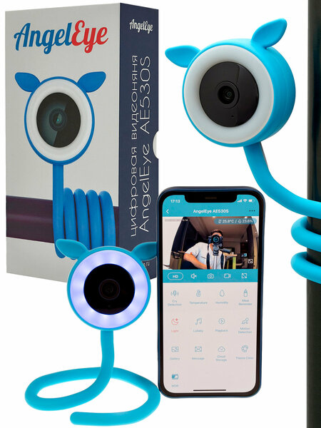 Wi-Fi видеоняня AngelEye AE530S прекрасное решение для контроля за ребенком как в дневное, так и в ночное время суток. Удобное гибкое основание и широкий угол обзора 107 градусов позволяют зафиксировать видеоняню на ручке кроватки/коляски и настроить необходимую область съемки. Удаленное подключение по wi-fi через удобное приложение на вашем устройстве IOS или Android дает возможность наблюдать за ребенком из любой точки Мира, радиус действия при таком типе подключения неограничен. Датчик звука и движения сообщит о пробуждении ребенка через отправку Push-уведомления. При недостаточном освещении видеоняня AngelEye AE530S 2.0 автоматически активирует ночную подсветку, радиус действия которой достигает 10 метров. Для записи прекрасных моментов взросления малыша в видеоняне предусмотрен разъем для карты памяти объемом от 8 до 128 Гб. Также есть возможность приобрести функцию облачного хранилища. Благодаря функции двусторонней обратной связи вы можете успокоить малыша звуком своего голоса или включить колыбельные мелодии. На основании камеры видеоняни расположена регулируемая цветная RGB подсветка-ночник. Управление ночником также осуществляется через бесплатное мобильное приложение.