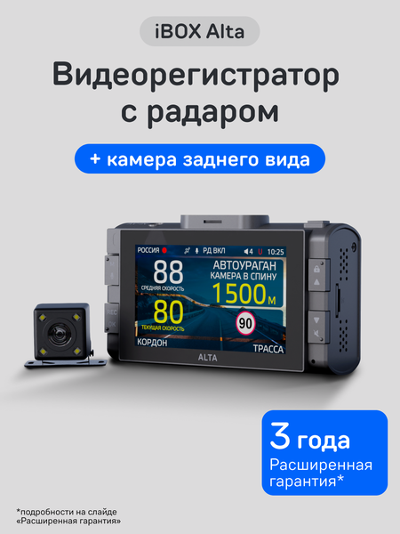 iBOX Alta LaserScan Signature Dual — автомобильный видеорегистратор с сигнатурным радар-детектором, оптимальным функционалом и фирменными технологиями iBOX Камера устройства с матрицей GalaxyCore и процессором SigmaStar записывает детализированное видео высокого разрешения Full HD. Технология WDR балансирует качество съёмки в сложных условиях, а CPL-фильтр предотвращает блики, засветы и увеличивает контрастность изображения. Данный комплект — с камерой заднего вида iBOX RC HD9. Двухканальная съёмка увеличивает обзорность записи, а также помогает ориентироваться при движении авто назад (функция «Ассистент парковки»). Гибрид заранее оповещает обо всех комплексах фотовидеофиксации нарушений ПДД. Собственная разработка LaserScan и сверхчувствительный модуль ADR Sens вовремя определяют полицейские радары, в том числе маломощные и направленные «в спину». Технология Signature Mode распознаёт комплексы фиксации нарушений по типу и названию, предотвращая ложные срабатывания. Параллельно технология RSF+Anti-Cas блокирует оповещения о датчиках активной системы безопасности автомобилей. А обновляемая библиотека Z-сигнатур отфильтровывает сигналы автоматических дверей, шлагбаумов и других источников помех. Также регистратор 3 в 1 информирует о полицейских камерах по встроенной базе 45 стран. Информация о средствах фотовидеофиксации обновляется еженедельно. Внимание! В зонах глушения GPS возможны сбои: показания скорости и оповещения по базе камер могут быть некорректными. Причина — не в устройстве, а в подавлении сигналов. GPS-модуль комбо-устройства определяет скорость авто и сохраняет координаты движения. Просмотреть записанный маршрут на карте вместе с видео можно в программе iBOX Player. Автомобильный видеорегистратор с радар-детектором устанавливается на удобное магнитное крепление, которое фиксируется на стекле при помощи двухстороннего 3М скотча. Питание подключается непосредственно в само крепление, поэтому гибрид удобно снимается с рабочего места и быстро ставится обратно. Для корректного завершения видеозаписи в экстренных ситуациях в устройство встроен суперконденсатор, способный работать в жару и холод (от -30 до +55 °C). Гаджет работает от сети (адаптер подключения к прикуривателю входит в комплект). Видеорегистратор может также работать через порт USB в автомобиле при стабильной подаче тока 5 В (кабеля в комплекте нет). Расширенная гарантия — 3 года. Необходимо зарегистрировать устройство на сайте iBOX в течение 30 дней с даты получения. Нажмите на лого и название магазина, чтобы увидеть ассортимент устройств или собрать комплект.