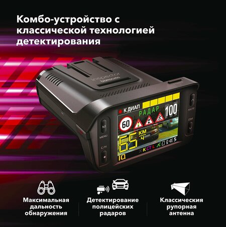 Модель обладает улучшенным качеством съемки Full HD (1080p), особенно в темное время суток, и увеличенным углом обзора до 135°. Основное отличие от большинства актуальных моделей - это отсутствие сигнатурного распознавания сигналов радаров. При этом устройство оснащено всеми ключевыми функциями современных комбо-устройств:
