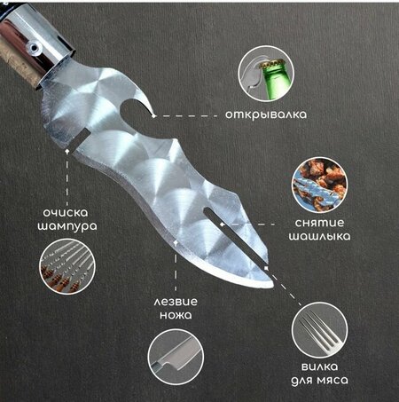 Нож для снятия мяса Нож для снятия шашлыка с шампура облегчит вам эту задачу благодаря продуманной конструкции - своему раздвоенному лезвию выполненному из нержавеющей стали и крепкой кованой ручке, 6в 1: ▶️с его помощью легко снимать шашлык с шампуров ▶️нарежет мясо, т. к. заточен с двух сторон ▶️можно использовать как открывалку для бутылок ▶️Длина лезвия-16см ▶️Ширина лезвия-5см ▶️Толщина металла рукоятки-2мм ▶️Толщина лезвия-0,03мм почему выбирают именно НАС? ✅Доступные цены! ✅% качество товаров-оригинал! ✅Огромый выбор! ✅Индивидуальный подход к каждому)