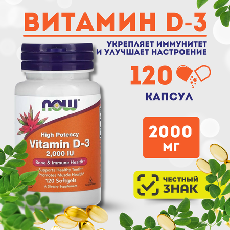 NOW High Potency 2000 IU - это капсулы с витамином D3 в легкоусвояемой форме. Обычно витамин D попадает в организм из еды либо вырабатывается кожей под воздействием солнечных ультрафиолетовых лучей. Однако в еде он содержится в недостаточном количестве. Поскольку многие люди стараются избежать воздействия солнечных лучей, необходимость в дополнительном приеме витамина D становится все более важной. Преимущества: способствует здоровой когнитивной функции; помогает поддерживать иммунитет; обеспечивает достаточную плотность костей и зубов; обеспечивает кальций-фосфорный обмен в костной ткани; стабилизирует секрецию паратгормонов, отвечающих за прочность скелета; препятствует деструктивным процессам в костной ткани; нормализует работу пищеварительной системы; способствует усвоению витамина А; уменьшает свинцовую интоксикацию; в основе препарата быстроусвояемая форма холикальциферола, полученного из ланолина. Рекомендации по применению: Принимайте по 1 капсуле в день во время еды. Противопоказания: Индивидуальная непереносимость компонентов. Если вы беременны, кормите грудью, принимаете какие-либо лекарства или страдаете каким-либо заболеванием, проконсультируйтесь с врачом, прежде чем принимать какие-либо пищевые добавки. Предупреждения: Хранить в недоступном для детей месте. Не следует превышать рекомендуемую дозировку. Не является лекарственным средством. Комплектация: 1 банка, 120 мягких капсул. Производитель оставляет за собой право изменить внешний вид упаковки, состав продукта, вкусовые добавки и его консистенцию. Мы стараемся следить за изменениями, но, если вы заметили какое-либо несоответствие, пожалуйста, сообщите нам об этом в разделе "вопросы о товаре". Благодарим!
