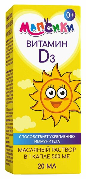 Масляный раствор витамина Д3 для детей со 2-ой недели жизни. Способствует восполнению дефицита витамина D3, улучшает всасывание кальция, участвует в формировании костной системы, способствует укреплению иммунитета. Противопоказания: повышенная чувствительность к компонентам продукта, гиперкальциемия, гиперкальциурия, кальциевый нефроуролитиаз, тиреотоксикоз (вероятность гиперчувствительности), почечная остеодистрофия с гиперфосфатемией, гипервитаминоз D. С осторожностью: при сердечной недостаточности, атеросклерозе, саркоидозе или других гранулематозах, органических поражениях сердца, почечной недостаточности, гиперфосфатемии, фосфатном нефроуролитиазе, острых и хронических заболеваниях печени и почек, заболеваниях ЖКТ (в т. ч. язвенной болезни желудка и двенадцатиперстной кишки), при гипотиреозе, при приеме дополнительных количеств витамина D3 (например, в составе других препаратов). БАД, не является лекарственным средством.