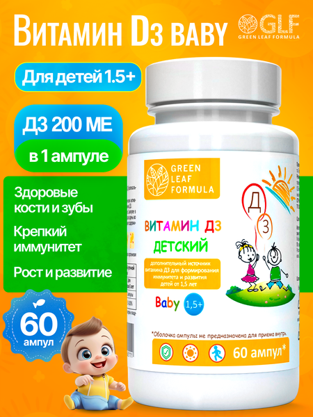 Витамин Д3 для детей от 1,5 лет, дозировка 5 мкг (200 МЕ) в 1 ампуле. Детский витамин Д3 выпускается в форме ампулы, содержимое ампулы выдавливается в напиток, на еду или в ложку. Витамин D3 играет особую роль в росте и развитии ребенка: - влияет на работу мозга, когнитивные способности (память и внимание); - поддерживает организм ребенка в период интенсивных физических и умственных нагрузок; - моделирует иммунную систему ребенка и увеличивает врожденный антимикробный иммунитет; - участвует в процессе формирования структуры костной ткани, способствует нормальному формированию скелета и зубов, способствует минерализации костей; - снижает риск развития рахита и переломов, используется для профилактики и лечения инфекционных заболеваний: хронического ринита и риносинусита, гриппа, вирусного гепатита; - улучшает самочувствие в целом. Не содержит: диоксид титана, химический краситель, ГМО, сою, глютен.