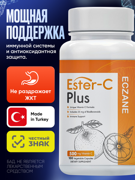 Витамин Ester-C Plus ECZANE с цитрусовыми биофлавоноидами - ваш надежный партнер в поддержке здоровья! Его уникальная формула содержит метаболиты, которые встречаются в природе. Эти метаболиты помогают вашим белым кровяным клеткам лучше удерживать витамин С, что является важным для вашей иммунной системы. Но это еще не все! Процесс производства витамина Ester-C на водной основе нейтрализует рН, делая его некислым и щадящим для желудка. Таким образом, вы получаете все преимущества витамина C без неприятных побочных эффектов. Состав БАДа Ester-C Plus ECZANE минимален, что делает его безопасным для вашего желудка. Данный витаминный комплекс подходит как для мужчин, так и для женщин. Он повышает активность, как физическую, так и умственную, помогая вам легче справляться с повседневными задачами, заниматься спортом и переносить плохую погоду. Мультивитамины представляют собой сбалансированную формулу, которая поддерживает иммунитет, здоровье нервной системы, повышает энергию и выносливость, а также способствует росту мышечной массы. А если вы заботитесь о своей красоте и здоровье, то витамины для женщин будут вашим надежным помощником. Они помогут поддерживать рост волос, улучшат состояние кожи, придадут ей гладкость и сияние. 1 Капсула Эстер-С с рекомендованной дозой 500 мг обеспечивают 24-часовую иммунную поддержку организма при простуде, ОРВИ, ОРЗ, гриппе. Они содержат натуральные цитрусовые флавоноиды, такие как лимон, сладкий апельсин, мандарин, лайм, ацерола и шиповник. Важно отметить, что БАДы не являются лекарством и не предназначены для диагностики, лечения или профилактики заболеваний. Перед использованием рекомендуется проконсультироваться с врачом, особенно если у вас есть какие-либо заболевания или вы принимаете лекарства. Применение простое: по 1 капсуле 1 раз в день во время еды. Заботьтесь о своем здоровье и поддерживайте свой организм с помощью Витамина Ester-C Plus ECZANE с цитрусовыми биофлавоноидами!