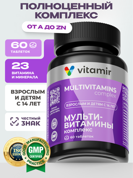 Мультивитамины для мужчин и женщин VITAMIR PRO — это универсальный витаминно-минеральный комплекс, разработанный для поддержки организма взрослых и детей старше 14 лет. Комплекс витаминов способствует укреплению иммунитета, нормализации обменных процессов и защите от оксидативного стресса. Описание компонентов: Витамин A помогает поддерживать здоровье глаз и нормальное зрение, предотвращая сухость слизистых оболочек. Витамин C активизирует защитные силы организма и повышает сопротивляемость инфекциям. Витамин D3 регулирует обмен кальция и фосфора, укрепляя кости и поддерживая мышечный тонус. Витамин E выступает мощным антиоксидантом, защищая клетки от повреждений и поддерживая иммунную систему. Витамины группы B помогают нервной системе, участвуют в клеточном росте и делении. Кальций укрепляет кости и зубы, поддерживает работу мышц. Магний регулирует синтез белков, снижает раздражительность и улучшает качество сна. Цинк способствует укреплению иммунитета и нормализации обменных процессов. Селен борется со свободными радикалами, поддерживает здоровый вид кожи и волос. Железо улучшает кроветворение и снабжение тканей кислородом. Марганец и Хром поддерживают метаболизм и усвоение питательных веществ. Йод нормализует работу щитовидной железы и обмен веществ. Рутин укрепляет стенки сосудов и поддерживает сердечно-сосудистую систему. Как принимать: Взрослым и детям старше 14 лет рекомендуется принимать по 1 таблетке 2 раза в день во время еды. Курс приема — 1 месяц. При необходимости курс можно повторить. Сертификация: Продукт «Мультивитамины для мужчин и женщин VITAMIR PRO» прошел сертификацию по стандартам GMP, ISO и "Честная дозировка" что подтверждает его высокое качество и безопасность. БАД не является лекарственным средством. Перед применением проконсультируйтесь с врачем. VITAMIR PRO — мультивитамины для мужчин и женщин, которые помогут поддержать здоровье, активность и жизненный тонус каждый день.