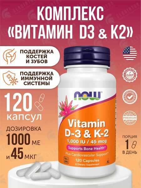 Now Foods Vitamin D3 1000 IU & K2 45 mcg — поддержка для ваших костей и сердца Сочетание витаминов D3 и K2 – это мощный союз, который способствует поддержанию здоровья ваших костей, иммунной системы и сердечно-сосудистой системы. Now Foods Vitamin D3 1000 IU & K2 45 mcg предлагает вам эти два ключевых витамина в удобной форме капсул, что позволяет обеспечить организм необходимой поддержкой каждый день. Преимущества витаминов D3 и K2: 1. Поддержка костей и зубов Витамин D3 помогает организму усваивать кальций, который необходим для крепких костей и зубов. Однако, чтобы кальций правильно распределялся в организме и не оседал в ненужных местах, нужен витамин K2. Этот витамин помогает направить кальций в кости, а не в артерии, где его накопление может привести к различным проблемам. 2. Поддержка иммунной системы Витамин D3 активно влияет на работу иммунной системы, помогая организму эффективно бороться с различными инфекциями и заболеваниями. Витамин D3 помогает активировать защитные механизмы организма, что особенно важно в периоды повышенной активности вирусов. 3. Здоровье сердца и сосудов Витамин K2 играет важную роль в поддержке здоровья сердца, помогая регулировать кальциевый обмен и поддерживать эластичность сосудов. Сочетание с витамином D3 помогает поддерживать здоровую работу сердца и сосудов на протяжении многих лет. 4. Улучшение общего самочувствия При регулярном приеме витамин D3 помогает улучшить общее самочувствие, повысить уровень энергии и настроения, особенно в зимний период, когда количество солнечного света ограничено. Этот витамин способствует нормализации уровня кальция в организме, что имеет положительное влияние на общую жизненную активность. Почему стоит выбрать добавку от Now Foods? Сбалансированная комбинация: В каждой капсуле вы получаете 1000 IU витамина D3 и 45 мкг витамина K2, что идеально соответствует потребностям вашего организма для поддержания баланса кальция и улучшения усвоения этих двух важных витаминов. Долговечность упаковки: 120 капсул в упаковке обеспечат вас витаминной поддержкой на длительный срок, что делает продукт не только полезным, но и экономичным выбором. Простота приема: Одна капсула в день — и ваш организм получает важнейшие витамины для здоровья. Качество от Now Foods: Эта добавка произведена компанией, которая славится своим высоким качеством и вниманием к деталям на каждом этапе производства. Рекомендуется принимать одну капсулу в день, желательно во время еды. Удобная дозировка позволяет легко включить этот комплекс витаминов в ваш ежедневный рацион. Now Foods Vitamin D3 1000 IU & K2 45 mcg — это идеальное сочетание для поддержания здоровья костей, зубов, иммунной системы и сердечно-сосудистой системы. Благодаря правильной дозировке этих витаминов, вы получите максимальную пользу и поддержку для организма. Это незаменимая добавка для тех, кто стремится поддерживать свое здоровье на высоком уровне и заботиться о своем теле каждый день.