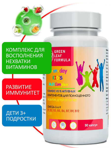 3-on-day KID’s MultiComplex - это уникальный, не имеющий аналогов по составу витаминный комплекс для детей от 3-х лет, включающий b-complex, мультивитамины для подростков, витамины для школьников и для всей семьи. Комбинированный состав из 15 компонентов просто необходим для регулярного приема как источник незаменимых нутриентов для ребенка в период его активного развития. Не надо отдельно покупать OMEGA 3 6 9 (рыбный жир, льняное масло или рыжиковое масло), витамин А, витамин С, витамин Е, витамин Д3 и витамины группы В (B1, B2, B3, B5, B6, B7, B9, B12) - все это есть в одной капсуле мультивитаминного комплекса. А биодоступная ее форма Softgel обеспечивает легкость в приеме для детей от 3 лет и лучшее усвоение комплексных витаминов. Комплекс витаминов 3-on-day KID’s MultiComplex заменяет сразу несколько препаратов: • для укрепления иммунитета – восполнение нехватки витаминов для крепкого здоровья, выработка антимикробного иммунитета и устойчивой защиты организма; • для обмена веществ - нормализация и поддержание обменных процессов в организме; • для мозга и нервной системы – обеспечивает полноценное развитие и поддержание умственной деятельности , нервной системы, улучшает память и концентрацию внимания; • для костей и суставов – обеспечивает полноценное развитие и поддержание деятельности костной системы, особенно в период развития детского организма; • для волос, кожи и ногтей - улучшение состояния волос, кожных покровов и ногтей; • для сердца и сосудов - правильное развитие и поддержание сердечно-сосудистой деятельности; • общеукрепляющие витамины - повышение энергии, активности и общего тонуса организма. Витаминный комплекс подходит для всей семьи. Не содержит: диоксид титана, химический краситель, ГМО, сою, глютен.