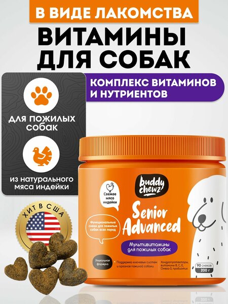 Buddy Chewz Senior Advanced (Бадди Чуз Синьор Эдвансед) – вкусные натуральные жевательные лакомства для собак, предназначенные для поддержания здоровья и укрепления иммунитета взрослых собак всех пород. В основе витамин для собак мелких, средних и крупных пород - свежее мясо индейки, гипоаллергенный источник животного белка, безопасное и полезное дополнение к основному рациону питомца. Вкусняшки для собак с витаминами укрепляют здоровье стареющих собак. Витаминизированное лакомство для пожилых собак позволяют поддерживать организм на клеточном уровне, предупреждая заболевания. Жевательные витамины для пожилых собак сохраняют здоровье опорно-двигательного аппарата, зрения и мочевыделительной системы. Натуральная пищевая добавка для возрастных собак укрепляет иммунитет и замедляет дегенеративные процессы. Этот витаминно-минеральный комплекс разработан специально для взрослых собак, чтобы компенсировать нехватку полезных веществ, возникающую с годами. Кормовая добавка не вызывает гипервитаминоза даже при сочетании с основным рационом, подходит для аллергиков. Магния биглиценат поддерживает здоровье сердца, нервной системы, мышечной функции. Улучшает здоровье суставов и костей. Витаминно минеральный комплес (В1, В2, В3, В5, В6, фолиевая к-та, В12, С, биотин) - поддерживает нервную систему, здоровье кожи и шерсти, улучшает зрение, обмен веществ и иммунитет. Хондропротекторы - защищают и восстанавливают хрящевую ткань суставов, уменьшают воспаления и боли. Bacillus subtilis&Bacillus licheniformis - колонии грамположительных бактерий, способствуют продуцированию ферментов, подавляющих рост патогенных микроорганизмов. Функциональные лакомства идеально подходят для дрессировки и поощрения собак. Buddy Chewz - выгодный комплекс витаминов в расчете на единицу действующего витамина.