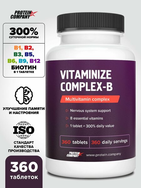 Витаминный комплекс VitaminizeComplex-B - предназначен для постоянного приема в дополнение к обычному рациону питания. Витаминная добавка применяется для профилактики и устранения гиповитаминоза и нехватки микроэлементов в условиях повышенных физических нагрузок и стресса. Спортивные витамины повышают выносливость и снижают уровень стресса. Витамины группы B — водорастворимые вещества, которые играют важную роль в клеточном обмене, необходимы для нормальной работы нервной, пищеварительной и сердечно-сосудистой систем организма. Неправильное питание, частые стрессы, хронические заболевания желудочно-кишечного тракта могут привести к гиповитаминозу B, который, в свою очередь, повлечет за собой целую цепочку функциональных расстройств. Свойства и влияние витаминов группы В на организм: В группу витаминов B входят 8 биологически активных веществ, обладающих схожими свойствами: тиамин (В1); рибофлавин (В2); никотиновая кислота (PP, В3); пантотеновая кислота (B5); пиридоксин (B6); биотин (B7); фолиевая кислота (B9); кобаламин (B12). Указанные витамины объединены в одну группу неслучайно. Все эти соединения являются активаторами ферментов, без которых невозможны многие биологические реакции, и обладают следующими свойствами: обеспечивают стабильность нервной системы; снижают негативное воздействие стрессовых факторов; улучшают когнитивные функции головного мозга; регулируют работу периферической нервной системы; участвуют в синтезе белков, РНК, ДНК, делении клеток; поддерживают иммунитет и гормональный баланс; обеспечивают работу сердечно-сосудистой системы и желудочно-кишечного тракта; лучшают состояние кожи, волос и ногтей. Рекомендации по применению: Размер порции - 1 таблетка. Принимать в любое время дня, запить достаточным количеством воды. Не превышать заявленную дозировку, проконсультироваться с врачом перед приемом. Продолжительность приёма 2-4 месяца, при необходимости повторить. Противопоказания: индивидуальная непереносимость, беременность и кормление. Состав в порции (1 таблетка) : Витамин B1 -5 мг, Витамин B2 - 6 мг, Витамин B3 - 20 мг, Витамин B5 - 5 мг, Витамин B6 - 6 мг, Витамин B9 - 600 мкг, Витамин B12 - 9 мкг, другие компоненты: сорбитол, поливинилпирролидон, магния стеарат, аэросил, ароматизатор вишня, сукралоза.