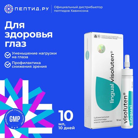 Натуральные пептиды Хавинсона. Разработка Санкт-Петербургского Института биорегуляции и геронтологии. В составе препарата пептидные биорегуляторы, выделенные из тканей глаза молодых животных. Визолутен оказывает адресное и избирательное действие на клетки сетчатки, цилиарных мышц и конъюнктивы, нормализуя их функции и метаболизм; регулирует функцию зрительного анализатора. При клиническом изучении установлена эффективность препарата Визолутен® лингвал для комплексного восстановления функции органа зрения при заболеваниях различного генеза, в том числе дегенеративно-дистрофических заболеваниях сетчатки глаза, посттравматической дистрофии роговицы, для профилактики усталости и раздражении глаз при длительной работе с компьютером и действии неблагоприятных факторов окружающей среды, в том числе производственных, а также при старении для оптимизации функции зрения. Рекомендован: