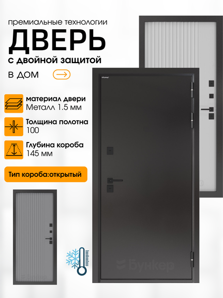 Уличная термодверь с терморазрывом “Гранд Термо” (чёрная фурнитура) — надёжная входная дверь с усиленной теплоизоляцией, разработанная для установки в частных домах и коттеджах. Современная конструкция с системой терморазрыва обеспечивает устойчивость к промерзанию даже при низких температурах. Мы работаем на рынке с 2014 года и знаем о дверях всё, поэтому даём официальную гарантию на товар и монтаж — 1 год. Профессиональный монтаж выполняют наши мастера по официальному договору: все работы фиксируются документально, и мы несем полную ответственность за качество. Монтаж является дополнительной услугой — по желанию клиента мы можем выполнить установку двери «под ключ». Доставка осуществляется собственным транспортом, что гарантирует полную сохранность двери при перевозке. После оформления заказа мы связываемся с покупателем для уточнения всех деталей. Конструкция и материалы Полотно толщиной 100 мм выполнено из стали 1,5 мм и утеплено по двухслойной технологии: — 1 слой: Минеральная плита EUROizol ECO плотностью 100 кг/м³ — 2 слой: Экструдированный пенополистирол плотностью 10 кг/м³ Короб открытого типа глубиной 145 мм, с утеплением и применением вспененного полиэтилена. В конструкции предусмотрен терморазрыв — полиамидный профиль толщиной 7 мм на полотне, предотвращающий образование мостиков холода. Три трубчатых D-образных контура уплотнения обеспечивают герметичность, защиту от продуваний и внешнего шума. Отделка и фурнитура Снаружи — металлическое покрытие с фигурным наличником ФН-2, окрашенное в тёмный цвет с порошковым покрытием "букле" и дополнительной оцинковкой, устойчивой к коррозии и внешним воздействиям. Фурнитура — чёрная матовая: ручка, ночник, сувальдные накладки со шторками. Дверь установлена на 3 петли с опорными подшипниками, обеспечивающими плавный и надёжный ход. Замковая система Установлены два замка российского производства BORDER (4-го класса безопасности): — Нижний замок: BORDER Гранд Термо 3В 9-6Э — в комплекте 4 ключа красного цвета — Верхний замок: BORDER Гранд Термо 3В 8-6Э — в комплекте 4 ключа чёрного цвета Оба замка относятся к высшему классу взломостойкости и обеспечивают надёжную защиту. Изоляция Благодаря системе терморазрыва и тройному контуру уплотнения, дверь обладает отличной тепло- и звукоизоляцией, исключая промерзание и мостики холода — оптимальный выбор для установки в дом с холодным климатом. Размеры и открывание Дверь доступна в типовых размерах и может быть изготовлена с правым или левым открыванием. Возможна установка — в зависимости от особенностей вашего проёма. Вы можете задать вопрос нам в чат — мы с удовольствием вас проконсультируем!