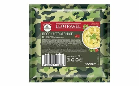 Пюре картофельное по-царски Картофель — овощ всех времён и народов. С ним можно приготовить огромное количество вкусных блюд и одно из них — картофельное пюре по-царски LeoTravel от леовит. Оно отличается изысканным вкусом и нежной текстурой. Из-за предрассудков простого народа картофель с трудом пробивал себе дорогу на столы людей, и долгое время был деликатесом только на царских столах, отсюда и такое название для картофельного пюре по-царски. Берите блюдо с собой в туристические походы или в путешествия: чтобы получить полноценный обед или ужин нужно просто добавить кипяток и несколько минут подождать. Картофельное пюре по-царски выпускается в удобных пакетах: они не займут много места в рюкзаке. Состав: картофель, заменитель сливок (кукурузный сироп, масло растительное, молочный белок), крахмал картофельный, мальтодекстрин, соль, витамин С, куркума, перец черный, регулятор кислотности – лимонная кислота