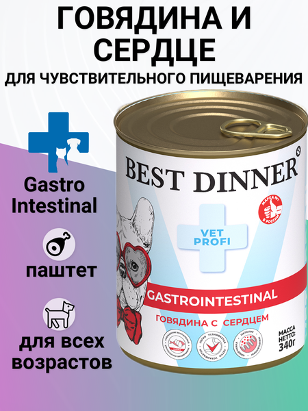 Влажный корм Best Dinner Vet Profi Gastro Intestinal для щенков и собак, для профилактики ЖКТ. Говядина и сердце 340гр