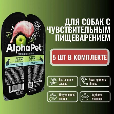 Влажный полнорационный корм холистик для собак с чувствительным пищеварением AlphaPet Superpremium "Кролик и яблоко мясные кусочки в соусе" 100г х 5 шт