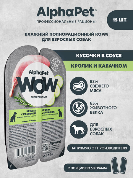 Влажный полнорационный корм холистик для взрослых собак AlphaPet WOW Superpremium Кролик с кабачком нежные ломтики в соусе (Упаковка 15 блистеров)