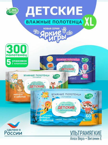 Влажные полотенца для новорожденных и всей семьи - незаменимый помощник для мамы и малыша! Этот набор содержит 5 упаковок салфеток XL по 60 штук с разным дизайном из серии "Яркие игры". Влажные салфетки без запаха имеют 99% воды, не содержат спирт, парабены и красители. Влажные полотенца антибактериальные большие обладают гипоаллергенным составом и бережно очищают и увлажняют нежную кожу, подходят для использования с первых дней жизни малыша. Детские влажные полотенца с гладкой текстурой не оставляют ворсинок и ощущение липкости. Наши влажные полотенца xl произведены из высококачественного материала, который особенно нежный в использовании, дает ощущение шелка, сохраняет идеальный баланс влажности и прочности салфетки, который так важен внимательным мамам малышей. Влажные полотенца xxl без запаха помогают бережно очистить лицо, ротик, ручки и тело младенца, обработать грудь перед кормлением. Влажные полотенца незаменимы при смене подгузника. Могут использоваться и как влажные полотенца для уборки. Одна салфетка может помочь решить максимальное количество задач, так как наши влажные полотенца детские хорошо пропитаны и имеют большой размер 25х15 см. Влажные полотенца xxl универсальные: можно использовать для снятия макияжа и косметики, в уходе за детскими игрушками, для сумки в роддом, в поездке на автомобиле, самолете, поезде, в походе. Влажные полотенца антибактериальные защищены от высыхания пластиковым клапаном. Они абсолютно экологичны, разработаны для удобного и комфортного пользования мамы, бабушки и беременных женщин! Влажные полотенца с клапаном – больше, чем просто средство гигиены. Это символ вашей любви и заботы, воплощенный в форме безупречного качества. Влажные полотенца большие становятся мостом между вами и вашим малышом, создавая моменты близости и доверия.