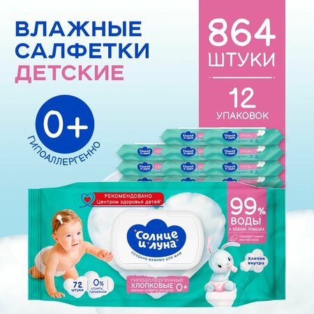 Влажные салфетки Ромашка и хлопковое молочко - это незаменимый помощник для заботливых родителей, стремящихся обеспечить максимальный комфорт и гигиену своему малышу с первых дней жизни. Детские влажные салфетки не оставляют ворса и разводов, что подтверждено положительными отзывами многих родителей. Мягкие, плотные салфетки пропитаны натуральными экстрактами ромашки и хлопкового молочка, что обеспечивает мягкое и эффективное очищение без раздражений и воспалений. В составе средства для гигиены отсутствую синтетические отдушки, салфетки гипоаллергенные. Салфетки влажные для новорожденных могут быть использованы для очищения лица, рук и тела. Салфетки для младенцев пропитаны лосьоном, состоящим на 99% из воды Набор влажных салфеток состоит из 12 упаковок по 72 штуки Одноразовые влажные салфетки универсальные: подходят для ухода за руками, лицом и телом, для снятия макияжа. Салфетки с крышкой удобно брать с собой на природу и в поездки, легко размещаются в сумке, в автомобиле, позволяя всегда иметь под рукой необходимое средство для очищения. Солнце и Луна - это бренд, который зарекомендовал себя как производитель качественной и безопасной продукции для детей.