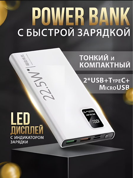 Универсальный Power Bank 10 000 мАч с быстрой зарядкой 22,5 Вт Заряжайте свои устройства быстрее с этим мощным Power Bank! Его емкость 10 000 мАч и поддержка быстрой зарядки 22,5 Вт обеспечат надежное питание для ваших смартфонов, планшетов и других гаджетов на ходу. Благодаря компактному дизайну и возможности брать с собой в самолет, этот Power Bank станет идеальным спутником в любых путешествиях. • Емкость: 10 000 мАч • Быстрая зарядка: 22,5 Вт • Совместимость: Подходит для зарядки смартфонов, планшетов и других USB-устройств • Индикатор заряда: Показывает оставшийся уровень заряда • Легкий и портативный: Удобно носить с собой Преимущества: • Мгновенная зарядка благодаря технологии Power Delivery (PD) 20 Вт • Зарядите свои устройства до 1.5-2 раз быстрее • Высокая емкость для длительного использования Не упустите возможность приобрести этот мощный Power Bank и забудьте о разряженных батареях!
