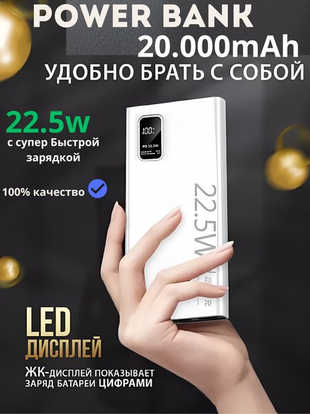 Универсальный Power Bank 20 000 мАч с быстрой зарядкой 22,5 Вт Заряжайте свои устройства быстрее с этим мощным Power Bank! Его емкость 20 000 мАч и поддержка быстрой зарядки 22,5 Вт обеспечат надежное питание для ваших смартфонов, планшетов и других гаджетов на ходу. Благодаря компактному дизайну и возможности брать с собой в самолет, этот Power Bank станет идеальным спутником в любых путешествиях. • Емкость: 20 000 мАч • Быстрая зарядка: 22,5 Вт • Совместимость: Подходит для зарядки смартфонов, планшетов и других USB-устройств • Индикатор заряда: Показывает оставшийся уровень заряда • Легкий и портативный: Удобно носить с собой Преимущества: • Мгновенная зарядка благодаря технологии Power Delivery (PD) 20 Вт • Зарядите свои устройства до 3 раз быстрее • Высокая емкость для длительного использования Не упустите возможность приобрести этот мощный Power Bank и забудьте о разряженных батареях!