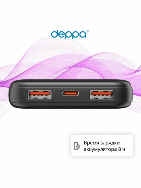 Внешний аккумулятор Deppa NRG Turbo V3 10000 mAh мощностью 22,5 Вт позволяет оставаться на связи и использовать подключаемые устройства без ограничений. • LED-индикаторы Обеспечивают контроль уровня зарядки, показывают процент заряда батареи. • Технология Quick Charge 3.0 Аккумулятор поддерживает быструю зарядку. • Безопасное использование Устройство защищено от перенапряжения, перегрева и короткого замыкания. • Емкость 10000 мА*ч Позволяет заряжать телефоны и другие устройства до четырех раз. Устройство оборудовано современными разъемами USB-A и Type-C. Корпус выполнен из пластика черного цвета.