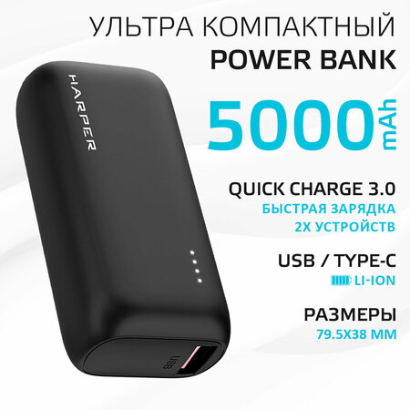 Внешний аккумулятор 5000 мАч - это незаменимое устройство для вашего телефона, планшета или ноутбука. Никогда больше не останетесь без заряда в самый неподходящий момент! Стильный и компактный, этот повербанк будет вашим надежным спутником в поездках, на прогулках или в офисе. Его мощность 5000 мАч позволяет полностью зарядить ваш телефон или любое другое устройство, умеет отключать питание при перегрузках и коротких замыканиях. Больше не нужно беспокоиться о разрядке батареи! Благодаря наличию разъемов Type-C и USB, вы сможете одновременно заряжать два устройства. Это особенно удобно, когда вы находитесь вдали от розетки или не хотите тратить время на поиск свободного разъема. Также обеспечена совместимость со стандартами быстрой зарядки Quick Charge 3.0 и Power Delivery (20 Вт). Идеальный выбор для тех, кто ценит качество и комфорт - Power Bank Harper PB-2606 с покрытием soft touch. Кроме того, он компактный и легкий, поэтому поместится даже в самую маленькую сумку или карман. Повербанк Harper PB-2606 - это надежное и качественное зарядное устройство, которое станет вашим верным спутником в любых условиях. Оставайтесь подключенными к миру с этим надежным внешним аккумулятором. Быстрая зарядка, удобный и компактный дизайн. Возьмите его с собой везде!
