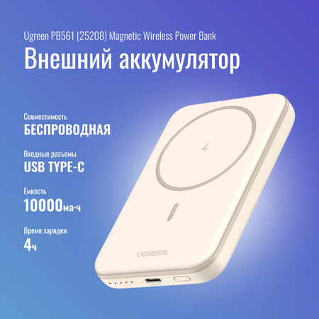 Ugreen PB561 (25208) Magnetic Wireless Power Bank - внешний аккумулятор магнитный. Дизайн устройства выдержан в стиле, характерном для экосистемы гаджетов Apple. Устройство совместимо с широким спектром устройств, поддерживающих беспроводную зарядку, включая iPhone, Samsung Galaxy, Google Pixel и другие смартфоны. Особенности: - компактная беспроводная модель; - быстрая зарядка; - вход и выход порта USB-C: 20 Вт. - магнитная беспроводная зарядка: 7.5 Вт/15 Вт. Ugreen PB561 (25208) Magnetic Wireless Power Bank - это удобный и компактный внешний аккумулятор, который обладает функцией беспроводной зарядки и магнитным креплением. Устройство оснащено мощной батареей емкостью 10000 мАч, что позволяет быстро и эффективно заряжать ваш смартфон, планшет или другие устройства в любое время и в любом месте. С помощью магнитного крепления вы можете легко прикрепить Power Bank к вашему устройству и продолжать пользоваться им даже во время зарядки, не беспокоясь о проводах и кабелях. Ugreen PB561 (25208) Magnetic Wireless Power Bank - надежное и удобное решение для всех, кто ценит удобство и мобильность в повседневной жизни. Комплектация: - внешний аккумулятор; - кабель USB-C; - документация.