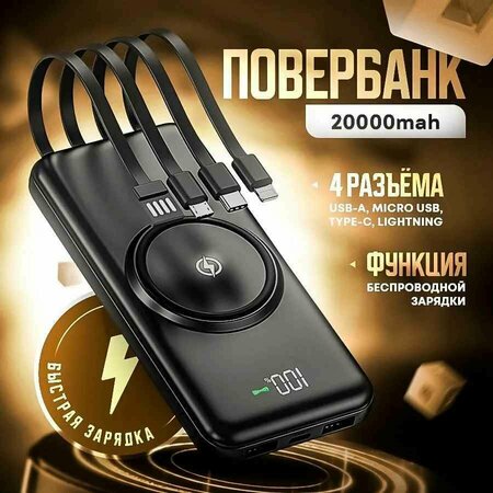 Портативное внешнее устройство для зарядки мобильных телефонов, планшетов и других электронных устройств. Оснащен батареей емкостью 20000 mAh, что позволяет осуществлять быструю зарядку даже крупных устройств. Портативный power bank на 20000 mAhс имеет набор с 4 универсальными кабелями: стандартный USB, Micro-USB, Type-C и Lightning. Можно использовать все одновременно. 3 входных разъема: 2 стандартных классических USB и Type-C. На передней панели электронный индикатор уровня и магнитное кольцо для беспроводной зарядки. Сбоку кнопка включения/выключения. Пауэрбанк совместим с гаджетами Apple, Samsung, Honor, Huawei, Xiaomi и другими. Перед использованием обязательно зарядить до максимума.