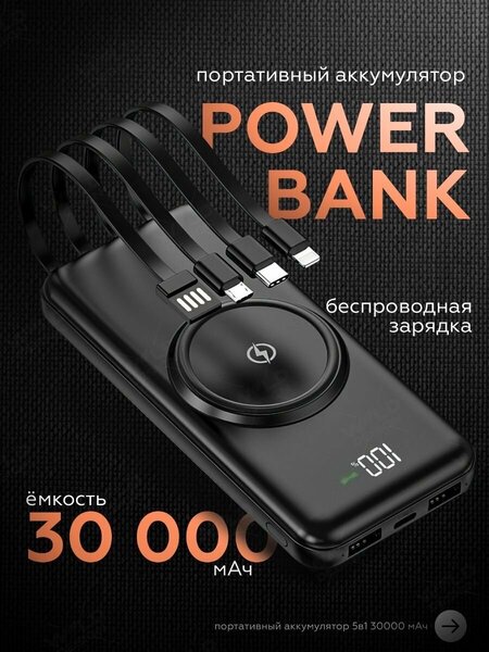Универсальный внешний аккумулятор с функцией беспроводной зарядки Power Bank обладает номинальной ёмкостью 30000 mAh и поддерживает множество протоколов. Устройство совместимо с большинством имеющихся современных девайсов: смартфонов, планшетов, камер и лэптопов. Аккумулятор оснащён выходными интерфейсами: USB, Micro USB, Type-C и Apple Lightning, а также функцией беспроводной зарядки Qi (только для смартфонов, поддерживающих функцию беспроводной зарядки). Защита и безопасность: в данной модели 30000 mAh использованы современные технологии безопасности, чтобы защитить ваше устройство, а также энергосберегающий и прочный аккумулятор. Есть встроенная защита от перезаряда, глубокого разряда и короткого замыкания. Индикатор заряда. Дисплей на передней части аккумулятора показывает текущий уровень заряда. Стильный дизайн Пауэр банка делает его не только практичным и функциональным, но и модным аксессуаром. Аккумулятор позволяет одновременно заряжать несколько устройств, а также поддерживает функцию сквозной зарядки, т. е. может заряжаться от сети с одновременной зарядкой подключённых устройств. На задней стороне аккумулятора расположены 4 встроенных переходника, благодаря чему вы никогда не потеряете их в поездке.