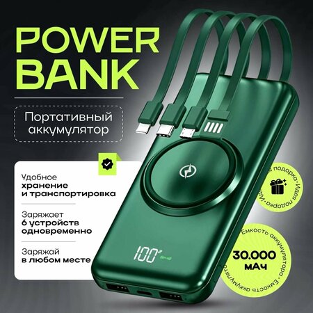 Универсальный внешний аккумулятор с функцией беспроводной зарядки Power Bank обладает номинальной ёмкостью 30000 mAh и поддерживает множество протоколов. Устройство совместимо с большинством имеющихся современных девайсов: смартфонов, планшетов, камер и лэптопов. Аккумулятор оснащён выходными интерфейсами: USB, Micro USB, Type-C и Apple Lightning, а также функцией беспроводной зарядки Qi (только для смартфонов, поддерживающих функцию беспроводной зарядки). Защита и безопасность: в данной модели 30000 mAh использованы современные технологии безопасности, чтобы защитить ваше устройство, а также энергосберегающий и прочный аккумулятор. Есть встроенная защита от перезаряда, глубокого разряда и короткого замыкания. Индикатор заряда. Дисплей на передней части аккумулятора показывает текущий уровень заряда. Стильный дизайн Пауэр банка делает его не только практичным и функциональным, но и модным аксессуаром. Аккумулятор позволяет одновременно заряжать несколько устройств, а также поддерживает функцию сквозной зарядки, т. е. может заряжаться от сети с одновременной зарядкой подключённых устройств. На задней стороне аккумулятора расположены 4 встроенных переходника, благодаря чему вы никогда не потеряете их в поездке.