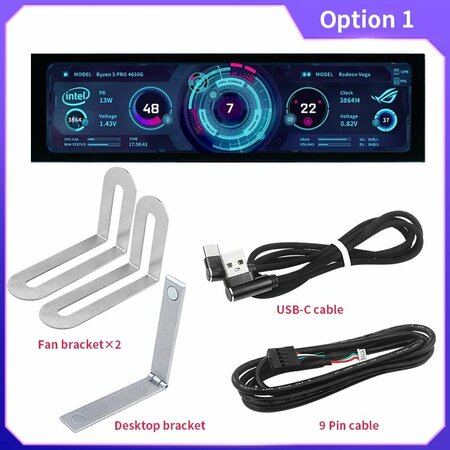 Вариант 1:1 X 8,8-дюймовый вторичный экран IPS (черный) 1 х USB-C кабель 1 х 9-контактный кабель 1 х кронштейн вентилятора 1 х Настольный кронштейн