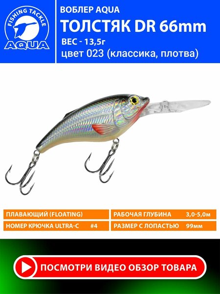 Воблер AQUA толстяк DR-66 (Deep Runner) – это средне-размерный пластиковый воблер, с увеличенной лопаткой - заглубителем, позволяющая облавливать глубины от 3,0 до 5,0m включительно. Форма Толстяка, а главное его игра понравились в равной мере щуке, судаку и окуню. Он успешен и при ловле «в заброс», с применением различных типов проводки, и при ловле «на дорожку» (троллинг). Корпус воблера и заглубляющая лопасть (язычок) изготовлены из ударопрочного пластика неподвластного зубам хищной рыбы и выдерживающая удары о донные камни при проводке. Игра воблера остается стабильной благодаря тщательно выверенной огрузке балластными шариками камеры стабилизации, что не дает воблеру заваливаться при медленной или рывковой проводке и при этом обеспечивается максимальная дальность и точность заброса приманки. Наличие широкополосного акустического резонатора и двух камер с небольшими металлическими шариками, создающими в процессе лова неповторимые акустические колебания, воспринимаемые боковой линией рыб, что так неотвратимо привлекает любого хищника на глубине не только в зоне «прямой видимости», но и на расстоянии до 17m. Тщательно выполненные в объеме даже мельчайшие внешние элементы (глаза, жабры, боковые, спинной плавник), двунаправленная 3D чешуя, разделенная боковой линией, с вакуумным нанесением светоотражающего слоя с эффектом голограммы и покраска стойкими флуоресцентными красками обеспечивает неповторимое сходство с живым мальком и делают воблер AQUA толстяк (Deep Runner) особенно заметным при ловле на глубине при небольшой степени освещенности или в мутной, темной воде. Дополнительный фактор провоцирующей хищника на атаку приманки являются увеличенные 3D-объемные глаза, так называемая «точкой прицеливания». Нанесение многокомпонентного лакового покрытия защищает воблер от царапин, сколов и повреждений при ловле самых зубастых видов рыбы, таких как щука, судак или другие хищники. Высококачественные японские тройники Ultra-C оптимального размера, которыми он оснащен, рассчитаны на ловлю любой рыбы, а их безупречная заточка позволяют подсечь улов даже при вялой, неуверенной поклевке. Вывод – воблер AQUA толстяк (Deep Runner) заметный в воде со всех сторон: сверху, снизу и сбоку действует на хищника неотразимо и, если в водоеме есть рыба - Вы ее поймаете, умело комбинируя тип проводки и цвет приманки!