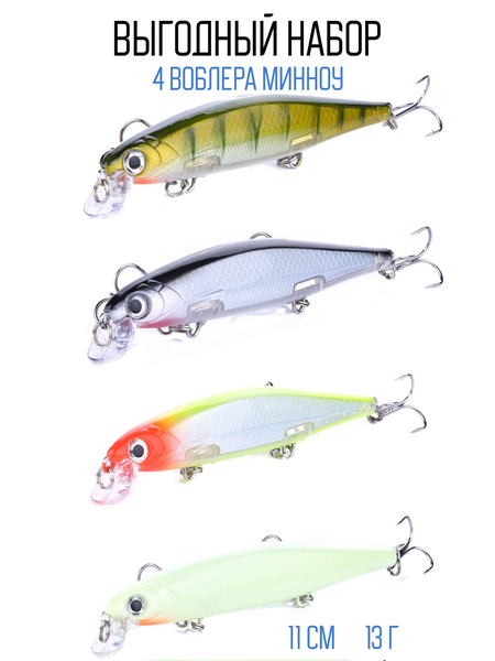 Воблеры Minnow представляют собой набор из 4 штук, каждый из которых имеет длину 11 см и вес 13 г. Они предназначены для скоростной проводки в верхних горизонтах воды, где подстерегают свою добычу хищные рыбы, такие как щука, окунь и жерех. Воблеры выполнены из высококачественного пластика с применением надежных тройников и фурнитуры. Это обеспечивает их долговечность и эффективность в использовании. Разноцветные воблеры имеют форму минноу и плавающий тип плавучести. Воблеры Minnow имеют степень заглубления 0-0,5 м, что позволяет использовать их для ловли различных видов рыб, включая окуня, жереха и щуку. В наборе 4 воблера, каждый из которых имеет свой уникальный цвет. Один воблер светится в темноте. Это позволяет подобрать приманку, которая привлечет именно ту рыбу, которую вы хотите поймать. Воблеры Minnow - это надежный и эффективный инструмент для ловли хищных рыб, который обеспечит вам богатый улов.