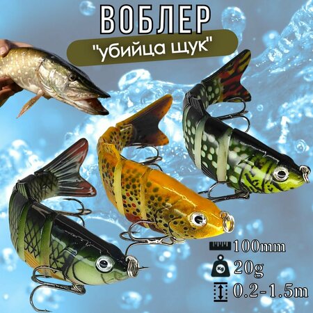 Предлагаем Вам набор из 3-х воблеров в кейсе качества Премиум Свимбейт – рыболовная приманка, состоящая из шести сегментов тела, соединенных между собой подвижным креплением, самым оптимальным весом 20гр и длинной 10см. Уловистый: - Реалистичный дизайн с 3D глазами, что делает приманку похожей на настоящую рыбу и облегчает привлечение целевой рыбы. - Потяните леску, и вслед за потоком воды приманка будет двигаться в S-образной форме, которая выглядит как настоящая рыба, плавающая в воде. - Данные приманки изготовлены из высококачественного материала, поэтому они очень прочные. Острые и прочные тройные крючки также играют важную роль в рыбалке. Стальной шар внутри- одна из важных составляющих приманки Свимбейт: 1. Благодаря установленному внутри стальному шарику, приманка может быть заброшена на более дальнее расстояние, что позволяет вести поиск на более широкой акватории. 2. Стальной шарик может создавать звук для привлечения целевой рыбы, что позволяет рыбе легче заметить вашу приманку. Именно по этой причине наша приманка может значительно повысить успешность рыбалки. 3. Стальной шар также может поддерживать приманку в хорошем плавательном положении и никогда не перевернется. Секретное оружие в вашем рыболовном ящике. Такой набор свимбэйт необходим каждому рыбаку, ведь он может стать той самой приманкой трофейного улова! С такой уловистой приманкой Вас будет ждать только удачная рыбалка и любой хищник по плечу!