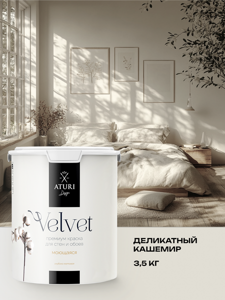 Краска для стен оттенка " Деликатный кашемир" Velvet от Aturi Design - отличное решение для преображения Вашего интерьера. Оттенок представляет собой светлый и нейтральный оттенок бежевого с теплыми нотками. Матовая текстура придает поверхности изысканный, стильный образ. Краска для обоев обладает уникальными характеристиками: легко очищается и является долговечной - вы сможете сохранить первоначальный вид стен надолго. Водоэмульсионная краска без запаха изготовлена с учетом безопасности и не содержит вредных веществ - безопасна для людей и животных. Экологичность и гипоаллергенность, использование высококачественных компонентов при производстве – все это подтверждает превосходно высокое качество, характеристики и стойкость акриловой краски для внутренних работ. Интерьерная краска легко наносится на различные поверхности, подходит в качестве краски для бетона, кирпича, штукатурки, ДСП, цемента, обоев и прочих поверхностей. Полная прочность достигается в течении 20-30 дней. В первый месяц не мойте окрашенную поверхность! Вы можете создать уникальный дизайн, комбинируя разные оттенки! Если у вас возник какой-то вопрос по продукции или нанесению, бренд Aturi design предоставляет бесплатные консультации и гарантию, вы можете связаться с представителями через официальный сайт. Краска дает плотное матовое покрытие, наносится при помощи кисти, валика или краскопульта. Окрашенную поверхность можно мыть, она надолго сохраняет свой первоначальный внешний вид, не выгорает на солнце, устойчива к царапинам и механическим повреждениям, термостойкая. Краска не имеет токсичного запаха, абсолютно безопасна для детей и домашних животных, ее можно использовать даже в детских комнатах и заведениях. Наши эмали и краски гипоаллергенные. Можно спать в окрашенной комнате уже в этот же день, краска без запаха. Водостойкая краска может использоваться для внутренних и наружных, в том числе уличных фасадных работ. Универсальная краска на акриловой основе подходит для пластика, дерева, деревянных поверхностей, бетона, загрунтованных стен, флизелиновых обоев под покраску, металла, кафельной и керамической плитки, гипса, стекла, керамики, вагонки, линолеума, кирпича, пластмассы и прочих поверхностей. Интерьерную краску допустимо применять для всех комнат в квартире или доме, кухни, ванны (ванной), прихожей, детских и взрослых комнат, балкона, для окрашивания офисов, кафе, ресторанов, учебных и прочих общественных заведений. Цветная быстросохнущая краска, перестает липнуть и пачкаться уже через 30-60 минут, полное высыхание за 1,5 часа. Расход строительной краски 80 - 120 гр на кв. м. По тщательно подготовленной и загрунтованной поверхности 1 кг хватит на 12 м2 в один слой. Краску при необходимости можно разбавить водой. Для нанесения кистью и валиком добавляется не более 10% воды от объёма краски. Для распылителя – до 15% воды от объёма краски. Если вам не понравится цвет или качество краски, мы гарантируем возврат денег на 100%. Интерьерная краска для стен, потолков и обоев премиальной линейки Velvet бренда Aturi Design позволит с лёгкостью поменять цвет в интерьере квартиры и осуществить запланированный дизайн комнаты своей мечты. Aturi Design - это лакокрасочные материалы высокого качества!